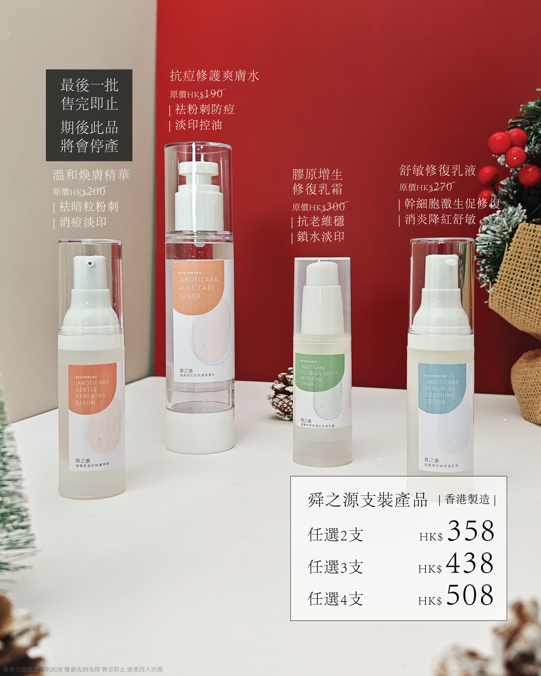 ⚠️ 最後一批庫存!嘉寶果溫和煥膚精華售完立即停產,錯過再難買到,趕緊入手~ 下單請於備註欄註明所選產品及對應數量 三支自由選,可選單品: 嘉寶果抗痘修護膚爽膚水、嘉寶果溫和煥膚精華、嘉寶果膠原增生修復乳霜、嘉寶果舒敏修復乳液 🎁聖誕優惠上線!任意消費就送品牌專屬化妝袋,讓肌膚煥新的同時,收穫滿滿聖誕儀式感🎄先到先得送完即止 ⏰ 優惠倒數!活動至 2025年12月16日 💬線上咨詢【https://wa.me/70721173/ 】 ⚠️溫馨提示: ▫️ 圖片僅供參考 ▫️ 效果因人而異 ▫️ 香港地區消費滿HK$358,享免運到順豐站或順豐智能櫃,不包括順豐合作點 ▫️ 香港地區消費滿HK$808,享免運到順豐合作點、住宅和工商地址 ▫️ 澳門地區消費滿HK$638享順豐免運 ▫️ 不接受延遲發貨 ▫️ 不支持分單發貨 ▫️ 不可與其他優惠同時使用 ▫️ 優惠受相關條款及細則約束 ▫️ 如有任何爭議,品牌方保留最終決定權利