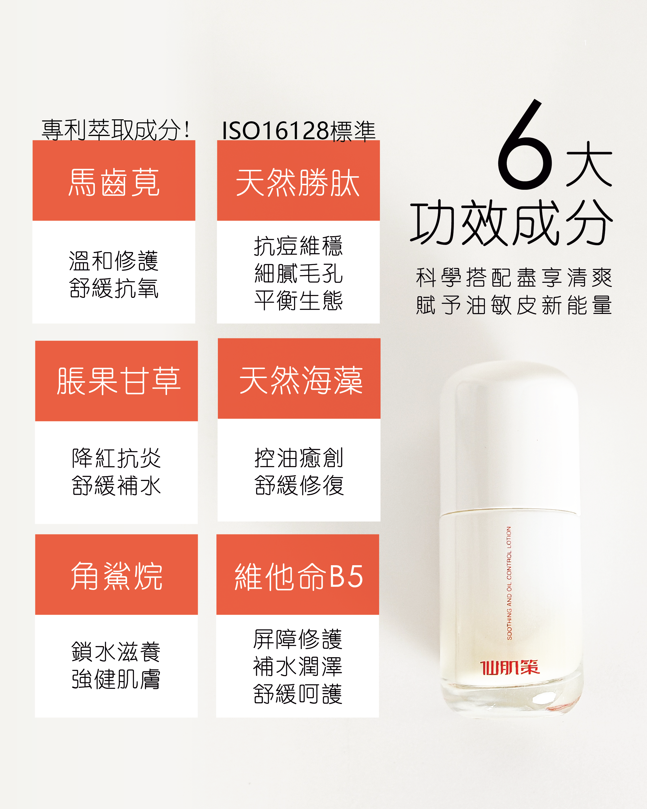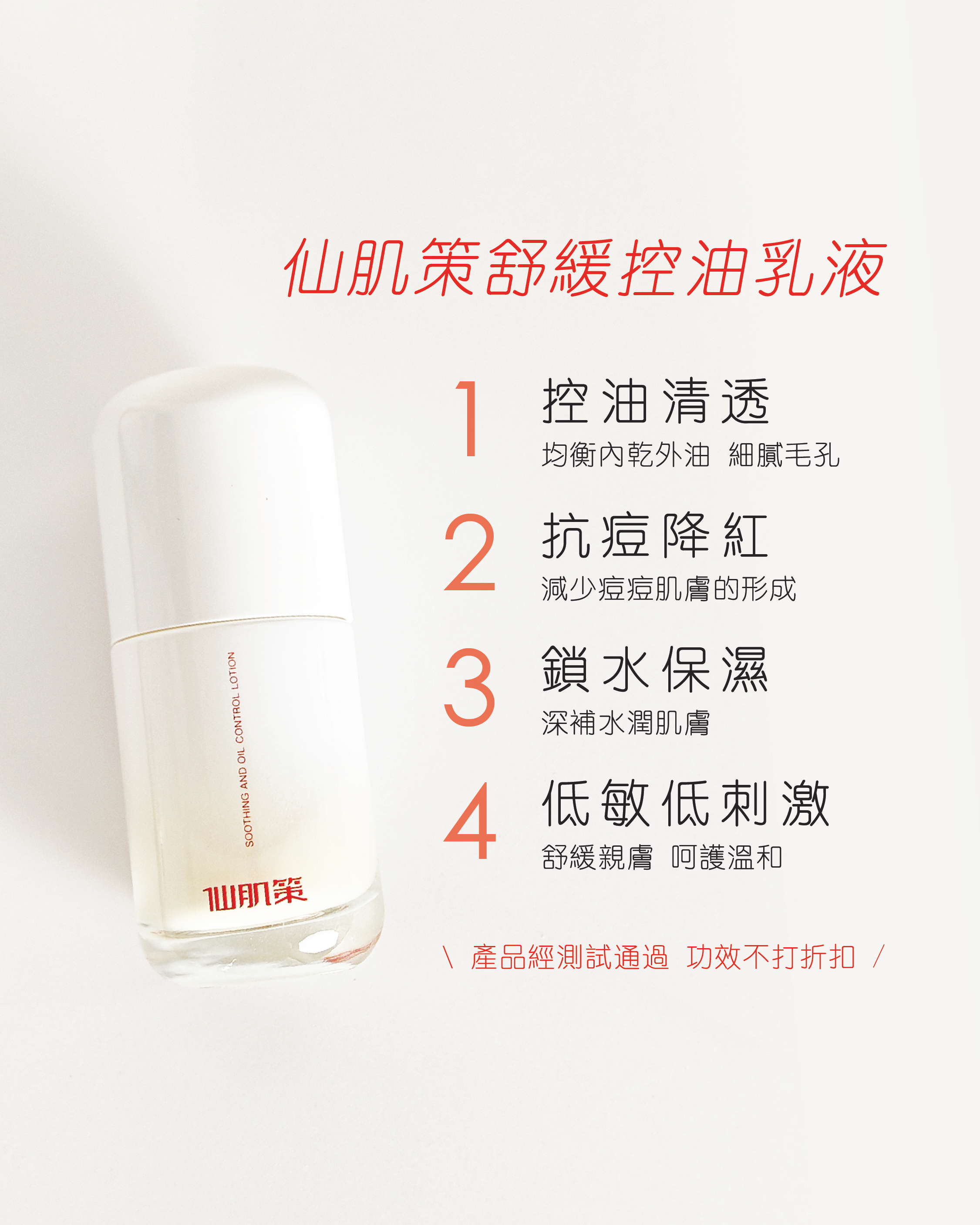 仙肌策舒緩控油乳液的舒緩和控油效果均通過實驗室嚴苛檢測,成分也都通過了安全檢測,功效與安全雙重保障,放心使用! [主要功效] 蘊含天然脹果甘草根和馬齒莧萃取物,溫和肌膚且有效舒緩肌膚不適。特別添加天然勝肽,能煥澤肌膚,提升肌膚呵護力,減少痘痘和油膩問題肌膚的形成。維他命B5、甜菜鹼與透明質酸鈉能深潤補水,搭配角鯊烷鎖住水分減少流失,呵護肌膚。配方舒緩親膚,溫和不刺激,能細膩毛孔,抗痘控油不緊繃,均衡內乾外油的肌膚問題。質地清爽不油膩,安心又透氣,令肌膚水潤細嫩,煥發光彩。 [功效成份] 馬齒莧、脹果甘草、天然勝肽、角鯊烷、維他命B5 [淨含量] 40毫升 [到期日] 2028年8月 [其他特點] 純素產品 [使用方法] 清潔肌膚後,取適量本品均勻塗抹於臉部肌膚,或點塗需要重點呵護的臉部肌膚位置,按摩至吸收即可,避開眼周及唇部。 [注意事項] 本產品僅供外用,不可食用,請存放於兒童觸及不到的地方。避免接觸眼睛,若不慎入眼,請勿揉搓,立即用清水清洗乾淨。孕婦使用前請諮詢醫生。 [貯存條件] 置於陰涼乾燥處,避免陽光直射及高溫;請置於兒童不易觸及處。 [產地] 中國 [條款細則] 圖片只供參考。資料由第三方提供,效果因人而異。